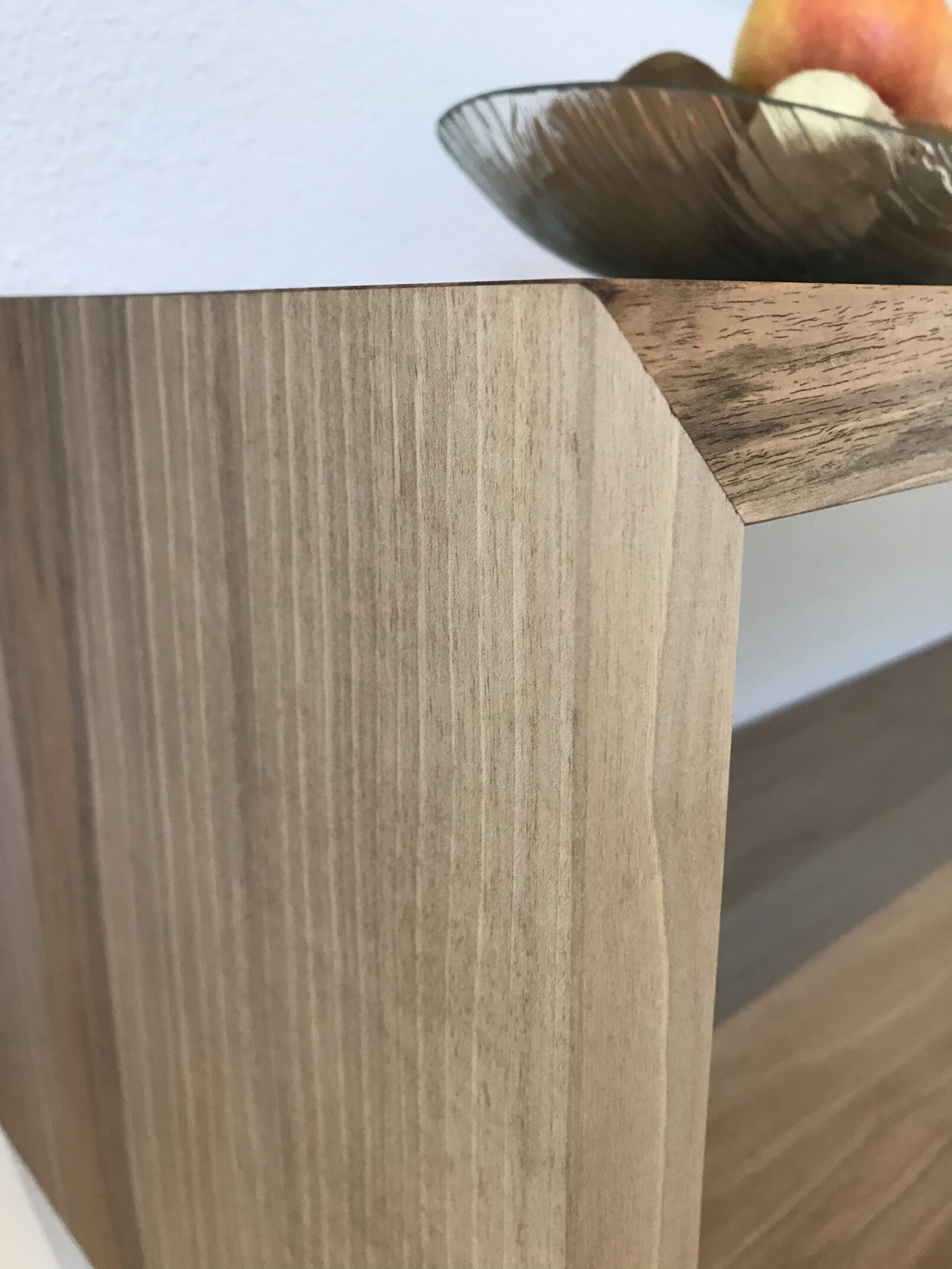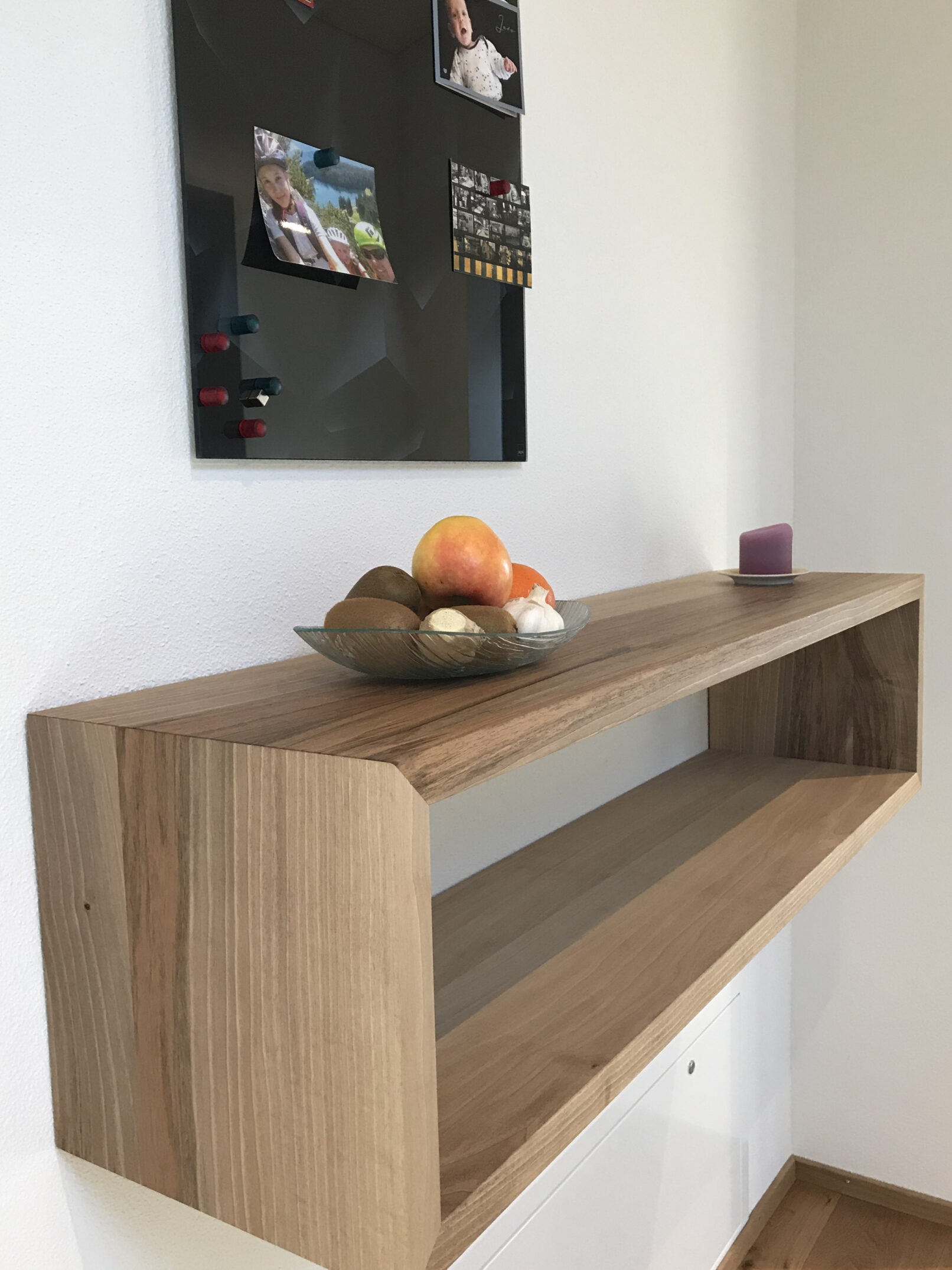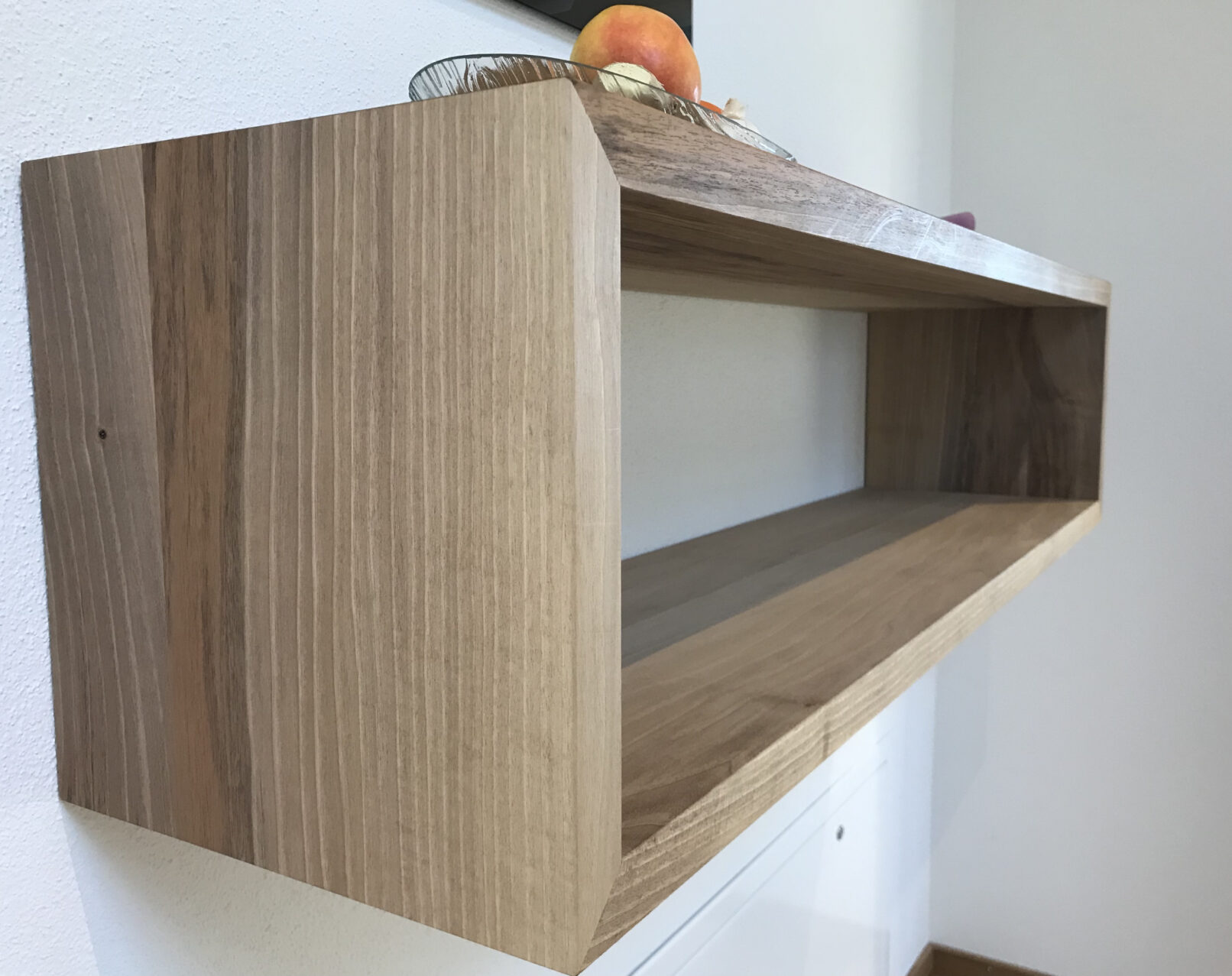 Massanfertigung in regionalem Nussbaumholz, mit verdeckter Wandmontage.